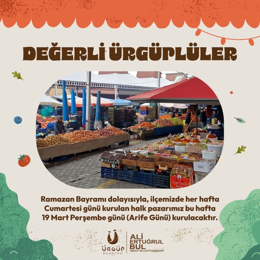 Ramazan Bayramı dolayısıyla, ilçemizde her hafta Cumartesi günü kurulan halk pazarımız bu hafta 19 Mart Perşembe günü (Arefe Günü) kurulacaktır.