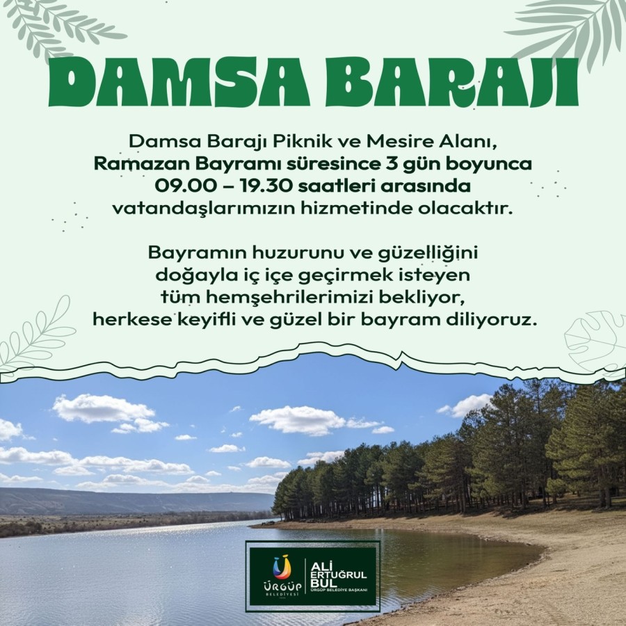 Damsa Barajı Piknik ve Mesire Alanı, Ramazan Bayramı süresince 3 gün boyunca 09.00 – 19.30 saatleri arasında vatandaşlarımızın hizmetinde olacaktır.